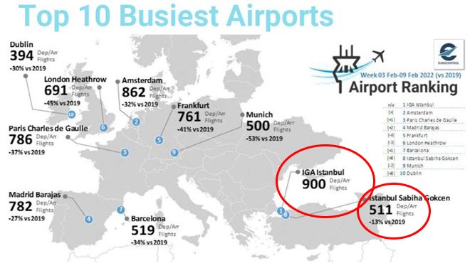 Verileri Eurocontrol Başkanı Eamonn Brennan paylaştı. 03-09 Şubat 2022 dönemine ait Eurocontrol verilerine göre havacılık sektöründe Türkiye’nin yüksek performansı devam ediyor. Şöyle ki, İstanbul’un iki havalimanı Avrupa’da ilk 10 arasına girdi. İstanbul Havalimanı günde 900 uçuşla Avrupa’da ilk sırada, Sabiha Gökçen Havalimanı ise günde 511 uçuşla sekizinci sırada yer aldı.
