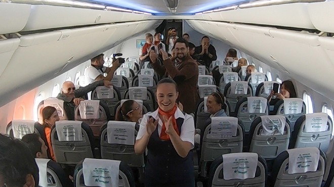 Kırmızı halılarla karşılanan misafirler, uçakta ise muhteşem bir sürpriz yaşadı. Pilot anonsunun ardından bir Yeşilçam efsanesi olan Türkan Şoray’la özdeşleşen “Sevemedim Kara Gözlüm” şarkısı eşliğinde gerçekleştirilen flashmob gösterisi büyük beğeni topladı.