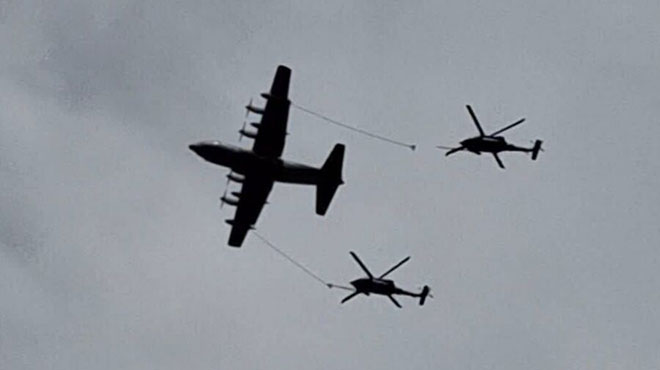 Sosyal medyada paylaşılan ve CBS News tarafından doğrulanan bir videoda, İran'ın güneyindeki Huzistan eyaletinde bir yakıt ikmal uçağı ile iki helikopterin alçak uçuş yaptığı görülüyor. İran'ın Tasnim ajansına göre ABD insansız hava araçları da operasyona katılıyor. İran devlet basınına göre uçak İran güçleri tarafından düşürüldü.