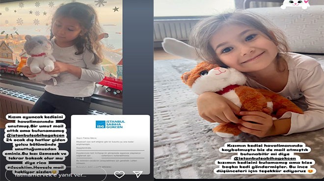 Küçük kızın annesinin sosyal medya hesabından Sabiha Gökçen Havalimanı’na yönelik “Bu kızı üzmesek ve tekrar baksak olur mu diye rica edecektim. Hevesle mail bekliyor sizden” şeklindeki yardım talebi üzerine SAW Care Müşteri Hizmetleri küçük kızı bir nebze sevindirmek amacıyla “Minik yolcumuz, en sevdiğin oyuncağının farklı bir yolculuğa çıktığını biliyoruz. Ama yepyeni bir dost senin için özenle seçildi! Umarız birlikte şahane maceralar yaşarsınız. Sevgilerimizle” notuyla yeni bir oyuncak kedi göndererek sürpriz yaptı.