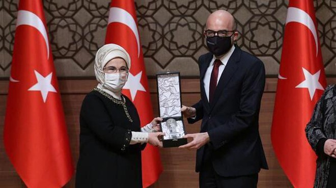 İstanbul Havalimanı’nın İşletmeci İGA’nın CEO'su Kadri Samsunlu'ya ödülünü Cumhurbaşkanı Recep Tayyip Erdoğan'ın eşi Emine Erdoğan takdim etti.
