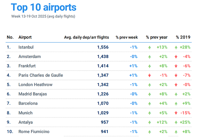 2025 Yılı 13-19 Ekim döneminde, Avrupa’daki en yoğun havalimanları arasında; İstanbul Havalimanı, günlük ortalama 1 556 uçuş ile ilk sırada yer aldı.