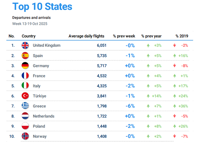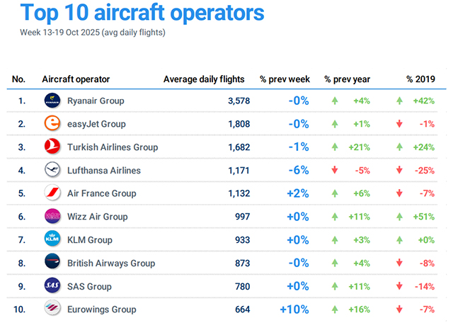 2025 Yılı 13-19 Ekim döneminde, Avrupa’da en fazla uçuş gerçekleştiren 10 Havayolu İşletmesi arasında; THY, günlük ortalama 1 682 uçuş ile 3. sırada yer aldı.