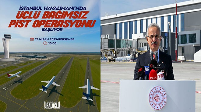 Ulaştırma ve Altyapı Bakanı Uraloğlu, İstanbul Havalimanı'nda "eş zamanlı üçlü bağımsız pist operasyonu"nun yarın başlayacağını bildirerek, bu sistemle aynı anda üç uçağın birbirinden bağımsız pistlere iniş kalkış gerçekleştirebileceğini açıkladı.