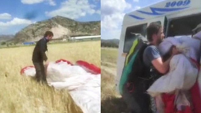 Kanadalı yamaç paraşütçüsü Denizli Çameli Yaylacık Dağı’ndan dün sabah atlayış yaptı. Paraşütçü, yaklaşık 110 kilometre uzaklıktaki Burdur'un Yassıgüme köyünde Kazım Öz’e ait arpa ekili tarlaya acil iniş yaptı. Ekili alanda paraşütçüyü gören Öz ise, ilk başta neye uğradığını şaşırdı ardından paraşütçünün yanına giderek cep telefonuyla sosyal medyadan canlı yayın yapmaya başladı. Çiftçi Öz ile çok az Türkçe bilen paraşütçünün diyalogları ise güldürdü.