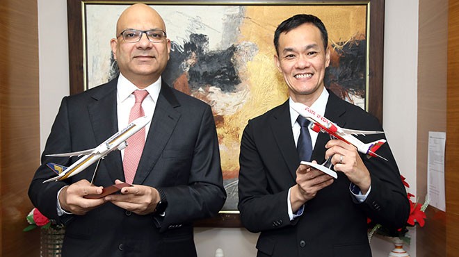 Air India Ticari Başkanı Nipun Aggarwal (solda) ve Singapore Airlines Ticari Direktörü Lee Lik Hsin (sağda), Delhi, Hindistan'da ortak uçuş anlaşması imza töreninde.