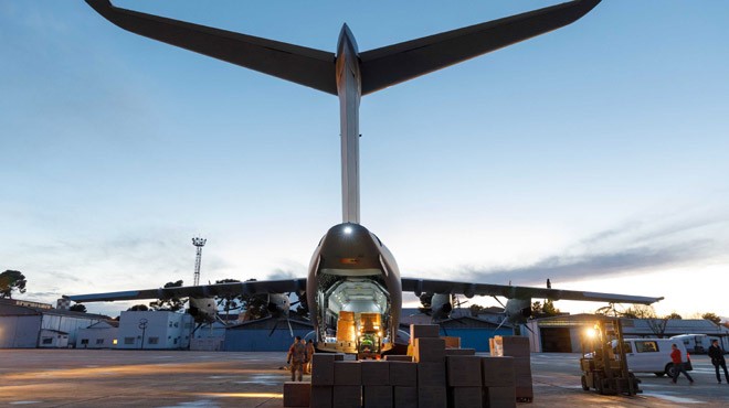 Bir Airbus A400M nakliye uçağı, İspanyol sağlık hizmetlerinde kritik öneme sahip maske ihtiyacını gidermek amacı ile Toulouse ve Madrid arasında bir hava köprüsü kurdu. Airbus tarafından işletilen MSN56 numaralı uçak, dün yerel saatle 18.07’de Airbus'ın Toulouse merkezinden havalandı. Uçağın 19.05’te Getafe Hava Üssü’ne (Madrid) inişinin ardından maskeler, İspanya Savunma Bakanlığı’na teslim edildi.