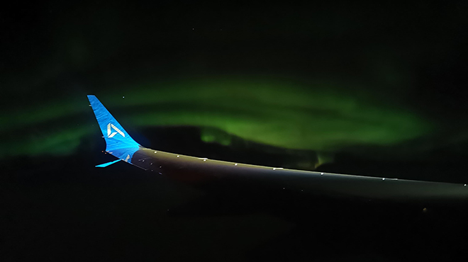 TC-OHT tescilli uçak, ABD’den Türkiye’ye uzanan yolculuğu sırasında Grönland üzerinden geçerken Kuzey Işıkları eşliğinde dikkat çekici görüntüler oluşturdu.