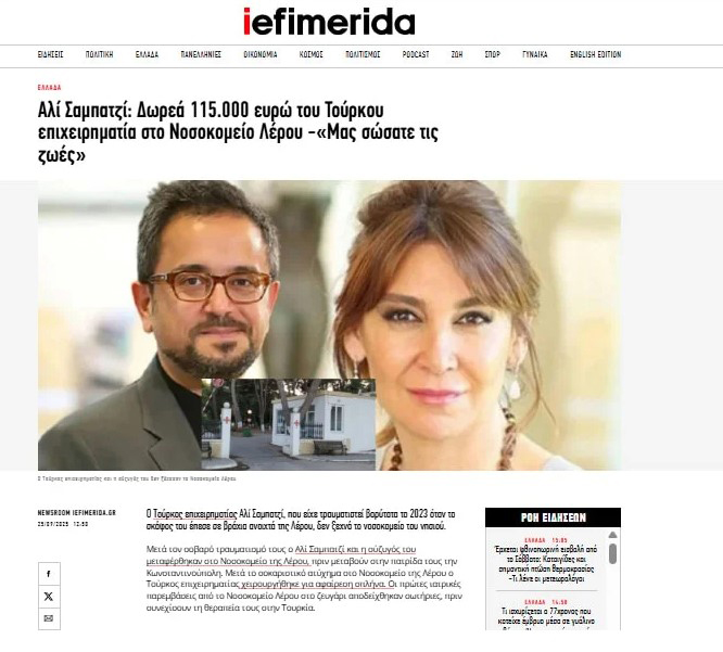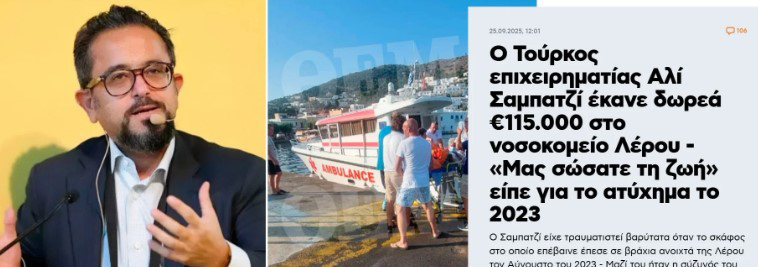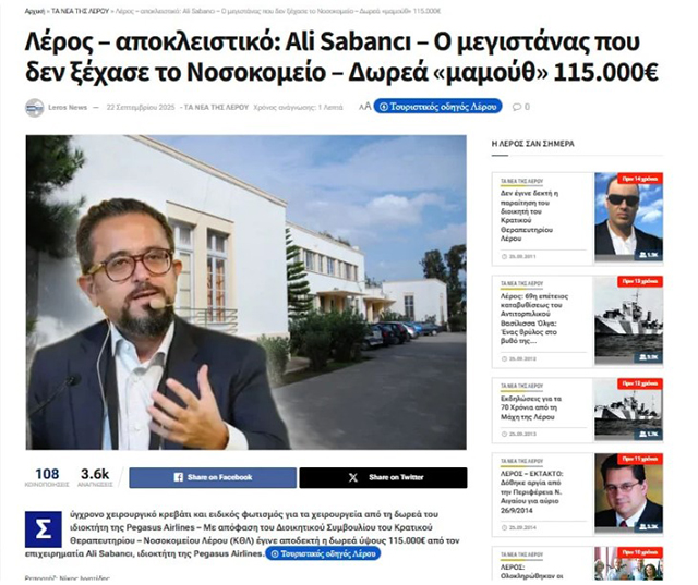 24 Ağustos 2023 tarihinde Bodrum’da tatilde iken, eşi Vuslat Doğan Sabancı ile birlikte yatı ile Leros adasına ziyarete giden Ali Sabancı büyük bir tekne kazası geçirmişti. Kazada ciddi şekilde yaralanan ve ilk tedavisi Leros adasında yapılan iş insanı Ali Sabancı’nın, kazadan sonra ilk kritik müdahalelerin yapıldığı Leros Devlet Hastanesi’ne 5,6 milyon Türk Lirası (yaklaşık 115 Bin Euro) bağışta bulunduğu ortaya çıktı.