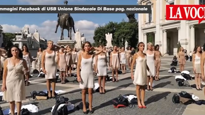 Roma'daki ünlü Campidoglio meydanında toplanan bir grup kabin memuru, işsiz kalmalarını protesto etti. Yavaşça kombinezonlarına kadar soyunan uçuş görevlileri, sonunda el ele tutuşup "Biz Alitalia'yız" diye slogan attılar.