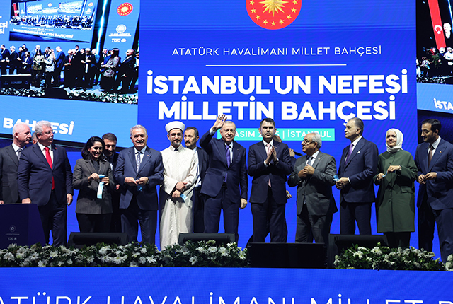 Birazdan yapımı tamamlanan Atatürk Havalimanı Millet Bahçesi'nin açılışını birlikte yapacaklarını aktaran Erdoğan, "Üstat ne diyor? 'Denizle toprağın visale erdiği' bu muhteşem şehri, yeşilin 1001 tonuyla, ağaçlarla, bahçelerle, renk renk çiçeklerle donatmanın heyecanını hep birlikte yaşayacağız. Yeni millet bahçemizde şehrimize nefes aldıracak, İstanbul'un çehresini güzelleştirecek dev bir eseri daha milletimize kazandırmış olacağız. Çevre Bakanlığımızı, TOKİ'mizi, yüklenici firmamızı işçisinden mimar ve mühendisine, şehre imzamızı attığımız bu muhteşem eserde emeği geçen herkesi yürekten tebrik ediyorum." diye konuştu.