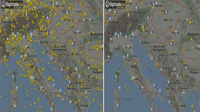 Birçok Avrupa’lı havayolu şirketi uçaklarının yüzde 90’ını yere indirdi. Flightradar24’te yer alan iki fotoğraf, durumu tüm açıklığıyla gözler önüne seriyor. Görüntülerden birisi 26 Şubat 2020’den, diğeri 25 Mart 2020’den.