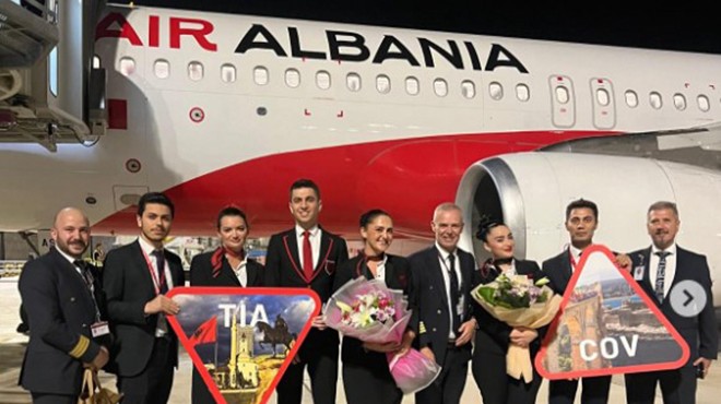 Tiran - Çukurova hattının ilk uçağı havalimanında su takı selamlamasıyla, kokpit ve kabin ekibi çiçeklerle karşılandı.