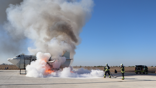 Alarm durumuna geçen Havalimanı Kurtarma ve Yangınla Mücadele (ARFF) ekipleri, kısa sürede olay yerine ulaştı. ARFF ekip liderinin ilk değerlendirmesinde, rüzgârın 21 pist yönünden 5 knot kuvvetinde estiği, uçağın sağ kanadının yanmakta olduğu ve mürettebatın kapıyı açarak acil tahliye slaydını aktif ettiği belirlendi. Yolcular slayt üzerinden tahliye edilirken yaralıların olduğu, ayrıca uçak içinde mahsur kalan yolcu ve mürettebatın bulunduğu senaryo gereği tespit edildi.