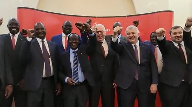 THY uçağı Juba’ya indikten sonra düzenlenen törene ülkenin Cumhurbaşkanı Yardımcısı ekibi ile birlikte katıldı. THY Genel Müdürü Bilal Ekşi’nin katıldığı törende Cumhurbaşkanı Yardımcısı ve beraberindekiler ”Turkish Airlines Oley” diye tempo tuttu.