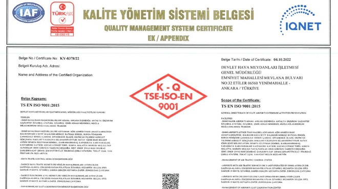 Devlet Hava Meydanları İşletmesi (DHMİ) tarafından işletilen tüm havalimanları ile Hava Trafik Kontrol Merkezi ve Havalimanları Slot Koordinasyon Merkezini de kapsayacak şekilde Kalite Yönetim Sistemi’nin kurulması ve TS EN ISO 9001:2015 Belgesi alınmasına yönelik incelemeler tamamlandı.