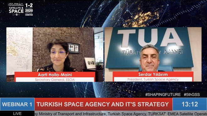 Capital Exhibition tarafından TURKSAT, Türkiye Uzay Ajansı, EMEA Uzay Operatörleri Birliği’nin desteğiyle online olarak gerçekleştirilen 5. Küresel Uydu ve Uzay Fuarı - Global Sat Show, dün başladı. Fuarın ilk gününde ESOA Genel Sekreteri Aarti Holla-Maini tarafından yönetilen ilk webinarda ‘Türkiye Uzay Ajansı ve Stratejisi’ konuşuldu. Online toplantının konuşmacılarından olan Türkiye Uzay Ajansı Başkanı Serdar Yıldırım, Türkiye'nin uzay yolculuğunun kısa zamanda gerçekleştirileceğini açıkladı.