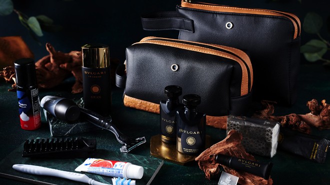 Emirates'in ayrıcalıklı bir uçuşla yolcularına konfor sunma taahhüdüne uygun olarak, güncel trendlerdeki renk ve tasarımları olan First ve Business Class seyahat kitlerinde, Emirates için özel olarak tasarlanmış şişelerde Bulgari kokuları bulunuyor. Yeni seri, First ve Business Class'ta klasik taba rengi ve siyah kumaş, leylaklı modern gümüş veya lila vurgulu abartısız siyah renklerde sekiz farklı koleksiyon çantası sunuyor.