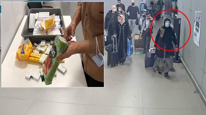 İstanbul Havalimanı'nda elektronik sigara filtresi kaçakçılığı yapan yabancı uyruklu bir kadın yolcu, düzenlenen operasyonla yakalandı. Operasyon kameralara yansırken, filtrelerin elbiseye özel olarak dikilmiş bölmelere ve çantasındaki meyve suyu kutuları, bisküvi ve çikolata paketlerine zulalandığı ortaya çıktı.