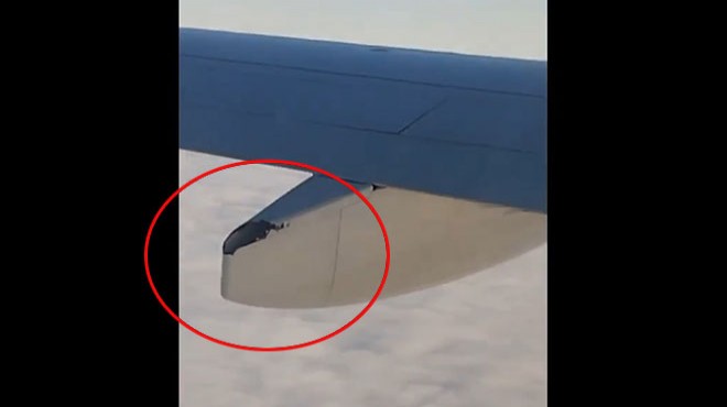 Düşen Azerbaycan Havayolları uçağından yeni bir görüntü. Aktau'ya inmek için Hazar Denizi üzerinde seyreden uçağın kanadında bazı parçaların (flap track fairing) koptuğu görülüyor.