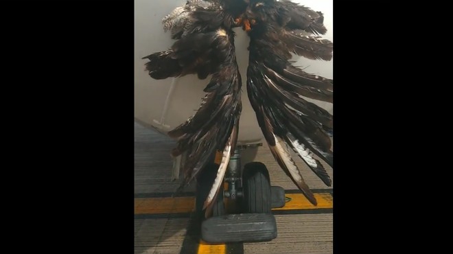 Uçağın radom olarak adlandırılan radarının bulunduğu burun kısmında dev bir kuşa ait kanat ve tüyler vardı.
