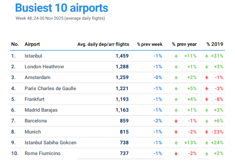 2025 Yılı 24-30 Kasım döneminde, Avrupa’daki en yoğun havalimanları arasında;