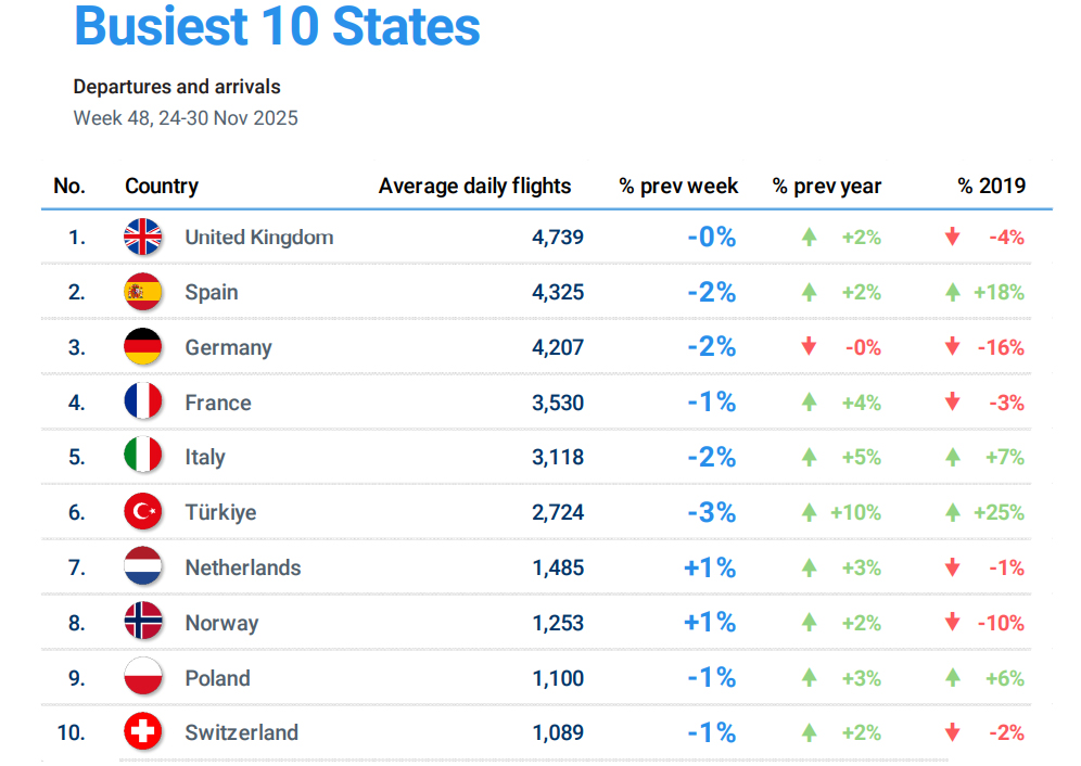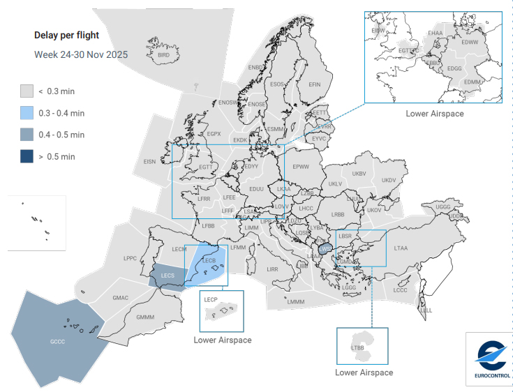 EUROCONTROL tarafından, 4 Aralık 2025 tarihinde yayımlanan Avrupa Havacılık Genel Bakış Raporu’nda yer alan “24-30 Kasım 2025” dönemi hava trafik istatistiklerine göre;