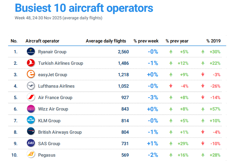 2025 Yılı 24-30 Kasım döneminde, Avrupa’da en fazla uçuş gerçekleştiren 10 Havayolu İşletmesi arasında;