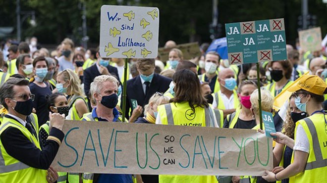 Berlin’de tarihi Brandenburg Kapısı önünde toplanan yüzlerce Lufthansa çalışanı, şirket yönetimine ve hissedarlara söz konusu toplantıda federal hükümetin hazırladığı kurtarma paketini tartışırken kendilerini düşünmelerini talep etti. Göstericiler, üzerinde "Lufthansa’ya evet -Biz Lufthansa’yız" ve "Siz bizi koruyun ki biz de sizi koruyabilelim" yazan dövizler taşıdı.
