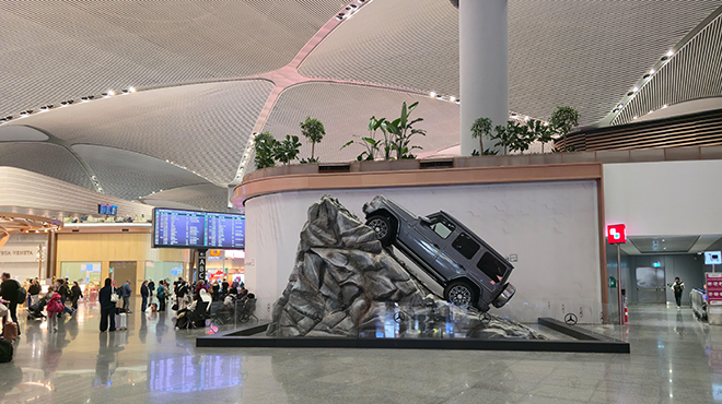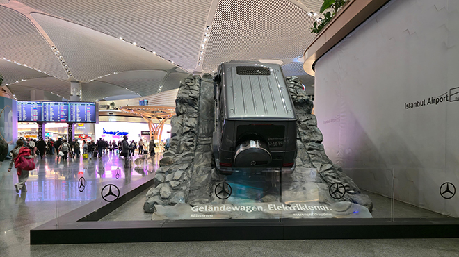 Bosphorus alışveriş alanında sergilenen Mercedes-Benz G 580, doğal kaya formu üzerinde konumlandırılarak markanın arazi gücünü ve elektrikli geleceğini bir araya getiriyor. Gerçek bir tırmanış hissi uyandıran bu dinamik kurgu, Mercedes-Benz’in yenilikçi ruhunu İGA İstanbul Havalimanı’nın modern mimarisiyle bütünleştiriyor.