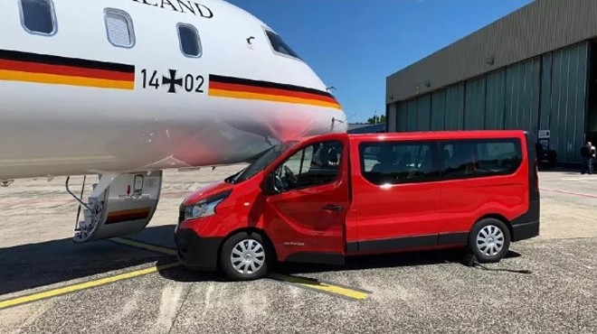 Kadın sürücü, Angela Merkel’in fotoğrafını çekmek için uçağın önünde durdu. Ancak kadın şoför el frenini çekmeyi unutunca minibüs uçağın gövdesine çarptı. Der Spiegel’e göre, kadın sürücü ‘Almanya Federal Cumhuriyeti’ yazısını görünce heyecanlandı ve fotoğraf çekmek için minibüsten atladı.