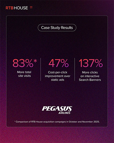 Pegasus Hava Yolları, Almanya pazarında yürüttüğü Search Banner kampanyasıyla RTB House’dan gelen site ziyaretlerini yüzde 83 artırırken, tıklama başı maliyette (CPC) yüzde 47 iyileşme sağladı.
