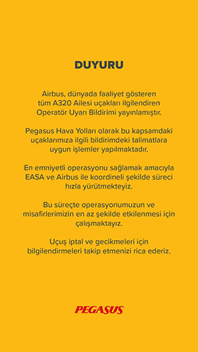 Yapılan açıklamada, “Pegasus Hava Yolları olarak, bu kapsamdaki uçaklarımıza ilgili bildirimdeki talimatlara uygun işlemler yapılmaktadır.