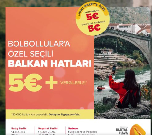 “Balkanlar'ı keşfetmenin tam zamanı!” denilen kampanya kapsamında, “Seçili Balkan uçuşlarına biletlerini 5 Euro +vergilerle al, 1 Şubat ile 28 Mart arasında keyifle gez! Üstelik 30.000 koltuk için geçerli ücretlerle Light Paket seçimine özel olarak kabin bagajı hakkı 5€ ve 12 kg’lık uçak altı bagajı hakkı 5€! “ denildi.