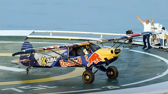 Sıra tarihi uçuşa geldiğinde ise iki defa pisti pas geçti, üçüncü denemede ise 56 katlı Burj Al Arab Oteli’nin 27 metrelik helikopter pistine inerek 20 metre 76 santimetrede uçağı durdurmayı başardı. Tarihi gösteri alkışlarla karşılanırken, Luke Czepiela motora tam güç vererek hızlandı ve Burj Al Arab’tan tekrar havalandı. Uçak kısa bir süre burun aşağıya inerken hızının artırmasıyla hızla yükseldi. Uçağın motorunun gücünü artırmak üzere yakıtına nitro eklendi.