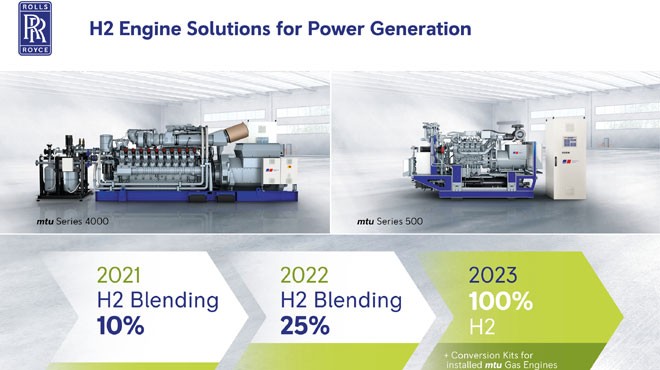 Rolls-Royce, enerji üretimi ve kojenerasyona yönelik mtu gaz motoru portföyünün yakıt olarak hidrojenle çalışacağını duyurdu. Böylece iklim açısından çevreye zararlı etkisi olmayan enerji arzı sağlayacak şekilde daha da geliştirilen portföy, %10 hidrojen gaz karışımıyla çalıştırılabilecek. Bugün hâlihazırda, mtu 500 Serisi ve 4000 Serisi gaz motorlarıyla çalışan jeneratörlerin, 2022 yılından itibaren %25 hidrojen katkı oranıyla çalıştırılması da mümkün olacak.