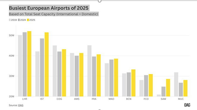 Havalimanlarını, arz edilen koltuk kapasitesi bazında derecelendiren OAG’ın “Avrupa’nın en büyük 10 havalimanı” değerlendirmesinde Sabiha Gökçen Havalimanı (SAW), 2025 yılında kapasitesini bir önceki yıla göre %15 artırarak 28,6 milyon tek yönlü (semi-route) koltuk kapasitesine ulaştı ve ilk 10 havalimanı arasında yıllık bazda en yüksek artışı kaydeden merkez oldu.
