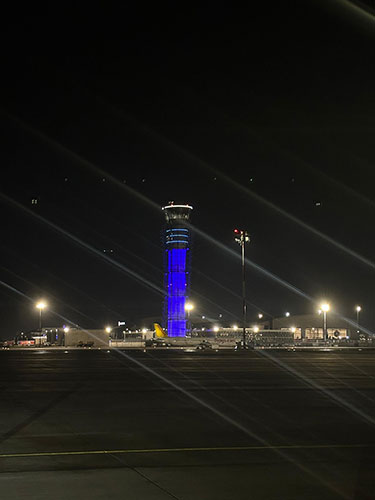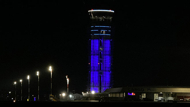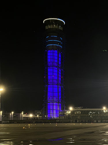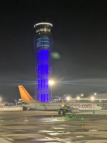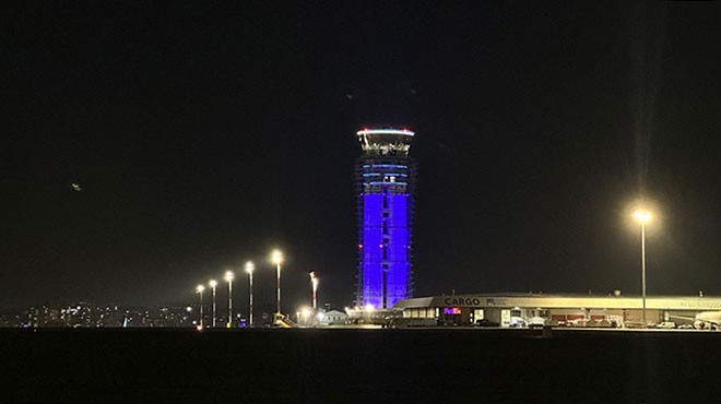 Havalimanının simge yapılarından Hava Trafik Kontrol Kulesi (ATC), mavi ışıkla aydınlatıldı.
