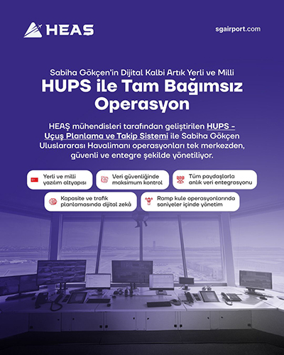 Sabiha Gökçen Havalimanı Meydan Otoritesi HEAŞ, havacılık sektöründe teknolojik bağımsızlık vizyonuyla önemli bir projeye imza attı. Daha önce yabancı menşeli sistemlerle yürütülen uçuş planlama ve takip süreçleri, artık HEAŞ mühendisleri ve teknik ekipler tarafından geliştirilen yerli ve milli yazılım HUPS (HEAŞ Uçuş Planlama ve Takip Sistemi) üzerinden yönetiliyor. 2010 yılından bu yana sürekli geliştirilen sistem, bugün havayolu şirketlerinden terminal işletmecisine kadar Sabiha Gökçen Havalimanı ekosistemindeki tüm paydaşların ana veri kaynağı haline geldi.