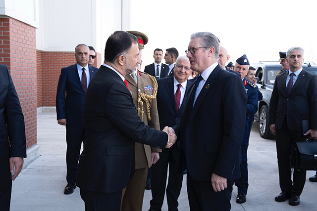 Starmer ve Healey’i Türk Havacılık Uzay Sanayi Genel Müdürü Mehmet Demiroğlu karşıladı.