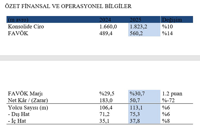 Devam eden yolcu büyümesi, Ankara’da yeni imtiyaz döneminin başlaması ve BTA’nın Antalya’da büyümesi sonucunda ciromuzu yolcu büyümesinin üstüne çıkardık. 2025 ciromuz yüzde 10 büyümeyle 1 milyar 823 milyon avro olarak gerçekleşti. FAVÖK cironun da üzerinde, yüzde 14 oranında büyüdü ve 560 milyon avroya ulaştı. Serbest nakit akışı ise yüzde 44 büyüme ile 223 milyon avro oldu. Kuvvetli nakit akışı sayesinde, yoğun bir yatırım yılında olmamıza rağmen net borcumuz yüzde 6 düşerek 1,6 milyar avroya indi. Net kâr 119 milyon avro tutarında bir kerelik nakit dışı etkilere maruz kaldı ve 51 milyon avro olarak gerçekleşti.