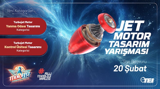 Dünyanın en büyük teknoloji yarışmalarına ev sahipliği yapan TEKNOFEST kapsamında TEI’nin yürütücülüğünde gerçekleştirilen Jet Motor Tasarım Yarışmalarına katılmak için son başvuru tarihi 20 Şubat 2025. Başvurular www.teknofest.org adresi üzerinden gerçekleştiriliyor.