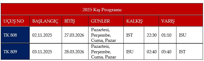 Türk Hava Yolları’nın Süleymaniye seferleri, İstanbul Havalimanı (IST) ile Süleymaniye Uluslararası Havalimanı (ISU) arasında Pazartesi, Perşembe, Cuma ve Pazar günleri olmak üzere haftada dört gün karşılıklı olarak icra edilecek olup, 27 Mart sonrasında ise uçuşlar her gün karşılıklı olarak gerçekleştirilecek.
