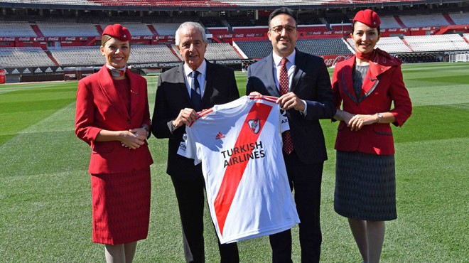 Bayrak taşıyıcı havayolunun River Plate forma sponsorluğu dün Arjantin’de taraflarca duyurularak kutlandı. Dünyanın en çok ülkesine uçan havayolu şirketi olan Türk Hava Yolları, dünyaca ünlü Arjantinli futbol takımı River Plate ile sponsorluk anlaşmasına vardığını geçtiğimiz haftalarda duyurmuştu. River Plate stadında, Türk Hava Yolları Yönetim Kurulu ve İcra Komitesi Başkanı M. İlker Aycı, River Plate Kulübü Başkanı Rodolfo D'onofrio, T.C. Arjantin Büyükelçisi Vural Altay ve çok sayıda basın mensubunun katılımıyla gerçekleştirilen ortak basın toplantısında taraflarca birlikte ilân edilen anlaşma ile Türk Hava Yolları, Arjantin’in en önemli futbol kulüplerinden biri olan River Plate’in forma sponsoru oldu.