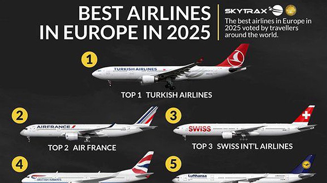 Türk Hava Yolları, 2025 yılında ‘Avrupa’nın En İyi Havayolu Şirketi’ kategorisinde birinci seçildi. İkinci sırada Fransız havayolu şirketi Air France, üçüncü sırada Swiss International Air Lines, dördüncü sırada İngiliz British Airways, beşinci sırada Alman Lufthansa yer aldı.