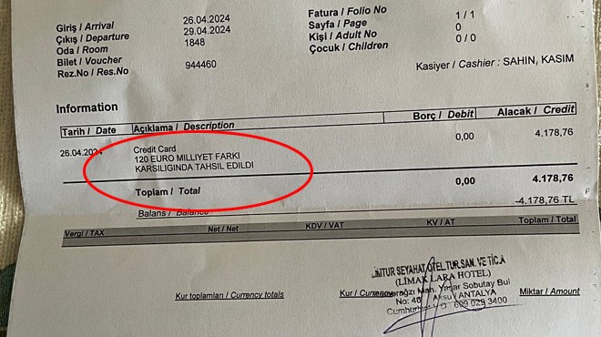 Limak Lara Hotel yetkilileri, rezervasyon yapanın bir Türk olduğunu anlayınca kendisinden 120 Euro (4 bin 178 lira) fazla ücret aldılar. Fatura kesen otel yönetimi, yaptıkları hareketi “Milliyet farkı karşılığı tahsil edildi” açıklaması ile faturaya işledi.