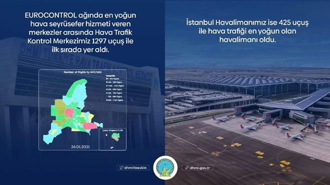 26 Ocak Salı günü tüm havalimanları yanında transit uçuşlarla birlikte Türk hava sahasında gerçekleşen 1297 uçuş ile Türkiye, Avrupa'da ilk sırada yer aldı.