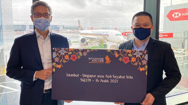 Singapur'un Türkiye Büyükelçisi Jonathon TOW (sol tarafta) ve Singapur Hava Yolları Türkiye Genel Müdürü Hongyao HU (sağ tarafta) 16 Aralık 2021'deki VTL uçuşunun açılışında hazır bulundu. Tow ve ailesi aynı zamanda Türkiye'den Singapur'a giden uçaktaki ilk VTL yolcusundan biriydi.