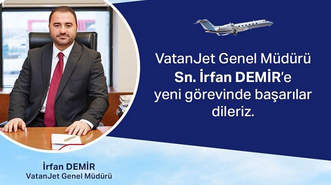 Onur Yılmaz’dan boşalan VatanJet Havacılık A.Ş., Genel Müdürlüğü’ne İrfan Demir atandı. Vatanjet’ten atamaya ilişkin yapılan açıklamada, “VatanJet Havacılık A.Ş., Genel Müdürümüz Sn. İrfan DEMİR liderliğinde, eşsiz hizmet anlayışıyla misafirlerine özel çözümler sunan, bölgesinde lider bir hava taksi vizyonuyla faaliyetlerini sürdürmeye devam edecektir. Genel Müdürümüze yeni görevinde başarılar dileriz.” denildi.