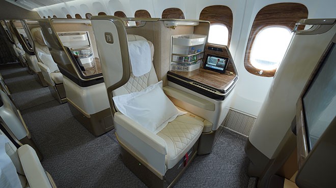 Dört sınıflı Boeing 777, altı veya sekiz First Class süit, dörtlü oturma düzeninde 38 Business Class, 2-4-2 düzeninde 24 Premium Ekonomi ve 256 Ekonomi Sınıfı koltuğuyla donatıldı.